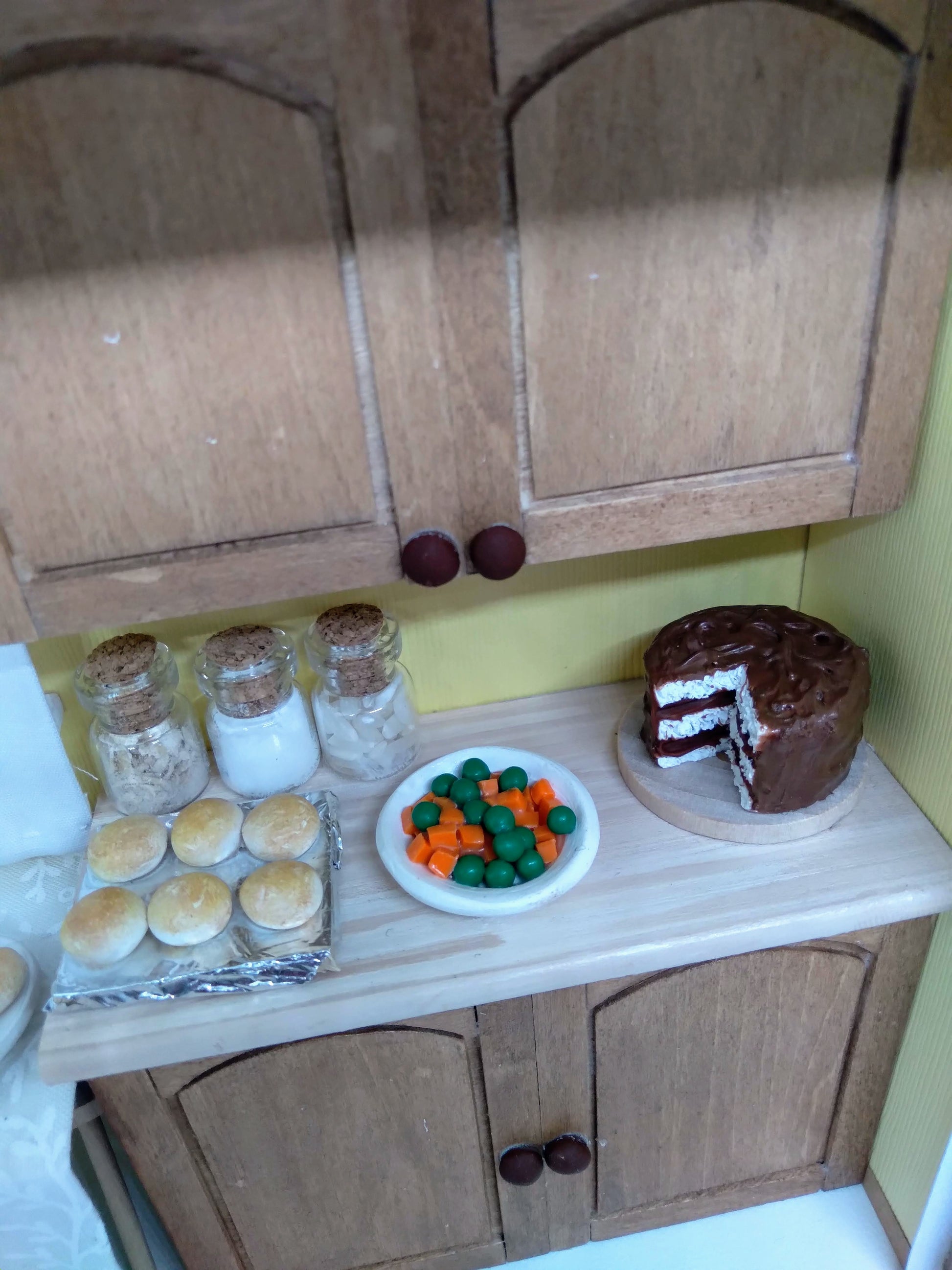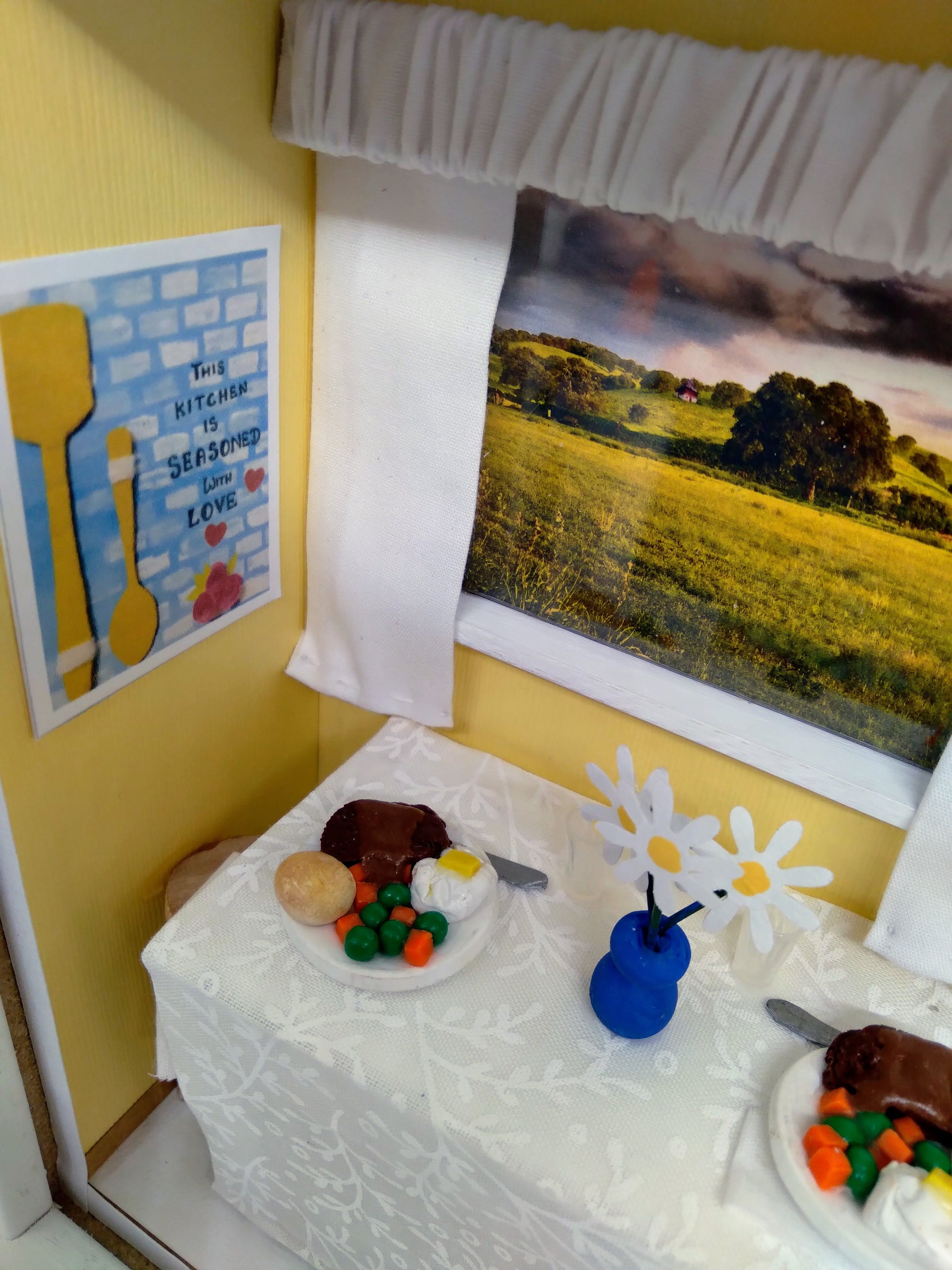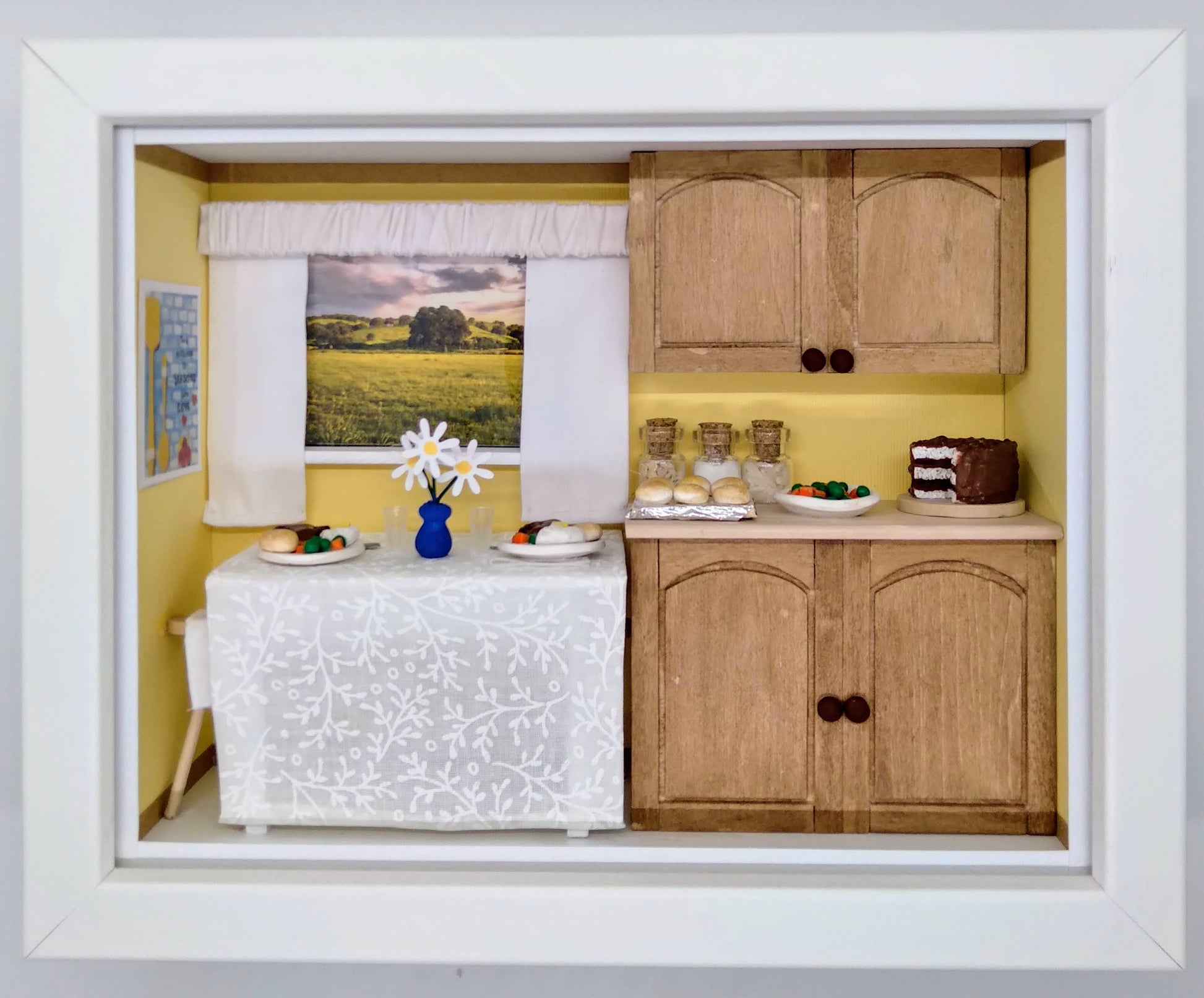"Comfort" shadowbox was a custom build for a customer who wanted her kitchen replicated in miniature with her favorite comfort meal "ready to eat".